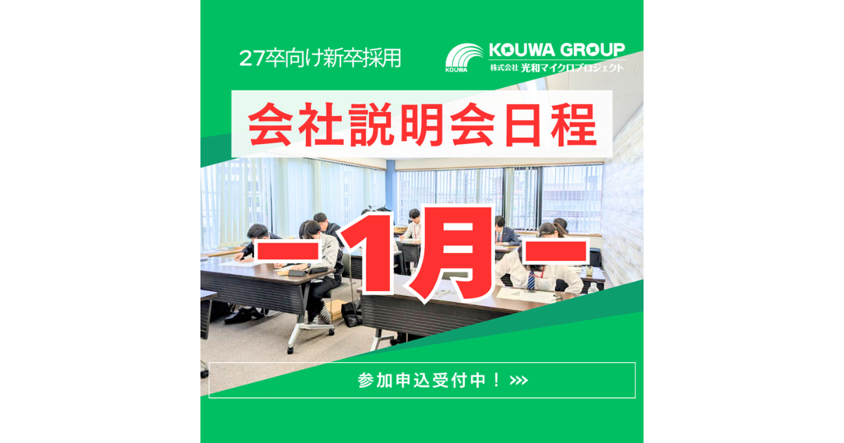 2025-09-01 採用情報 【9月開催】【26卒向け】会社説明会のお知らせ|少人数&WEB or 対面で開催! 2025-04-03 採用情報 2025年度 入社式 ☆祝☆8名の新たな仲間が加わりました! 2024-10-08 採用情報 【新卒採用】2024年度 内定式行いました。 2024-09-09 採用情報 📢オープンカンパニー開催のお知らせ📢 2024-04-01 採用情報 4月1日 ☆祝☆新しい仲間が加わりました♪ 2024-03-21 採用情報 【イベント】4月20日(土) 地域社会貢献活動イベント開催します。 2024-03-01 採用情報 【新卒採用】2025年卒 新卒採用活動が本格的にスタートしました! 2023-10-30 採用情報 【新卒採用】2024年卒 イベント報告+2次募集中 2023-09-15 採用情報 【新卒採用】2024年卒 秋採用積極活動中 12» kouwa.micro 愛知県豊明市のソフトウェア開発企業です🧑🏻💻👩🏻💻💭🌐 《業務系アプリケーション・制御系システム》 . 社内の様子や採用情報を発信します🌈 フォローお願いします! なにかご質問等ございましたらDMまで✉!! 🎄🎅🎁✨️ 今年も残すところあとわずか…! クリスマスが近づき、街も華やかなイルミネーションに彩 🚙 こんにちは!採用担当照喜名です✨ \2026年卒向け/\秋採用強化中/\内定まで最短2週間/ … 11月7日に内定者の皆さんをお迎えし内定式を執り行いました✨️ 初めは緊張した面持ちの皆さん 🍂 \11月の会社説明会、日程公開しました!/ オンラインOKなので、すきま時間でも参加しやすい \27卒向け・ソフトウェア開発職オープンカンパニー開催!/ “クルマの頭脳”を創る、自動車ソフトウ みなさんこんにちは! 株式会社光和マイクロプロジェクト 採用担当の照喜名(てるきな)です。 今朝は玄 はいさ~い🌺㈱光和マイクロプロジェクト 採用担当の照喜名やいびん。 (みなさんこんにちは!(株)光 🌻 みなさんおはようございます☀ 今日の朝、日陰がとても涼しくて夏の中の秋を見つけた気がしました✨ みなさんこんにちは! 光和マイクロプロジェクト採用担当のてるきなです🍍 毎日異常な暑さですよね🥵 💻【光和マイクロプロジェクト】7月会社説明会💻 🌱「ITって難しそう…」 ➡︎ そんなあなたにも寄 ✨社員インタビュー Vol.1✨ 2025年4月に入社した新入社員の「Y」くんにインタビューしまし ✨社員インタビュー Vol.1✨ 2025年4月に入社した新入社員の「Y」くんにインタビューしまし ✨社員インタビュー Vol.1✨ 2025年4月に入社した新入社員の「Y」くんにインタビューしまし ✨社員インタビュー Vol.1✨ 2025年4月に入社した新入社員の「Y」くんにインタビューしまし 👩💻💭 こんにちは!!お洒落な採用担当に憧れているてるきなです🧑💻笑 作業風景を撮ったので自 🍻🧑🤝🧑 みなさんこんにちは!光和マイクロプロジェクト採用担当です🙋🏻♂️ 5/30に新入社員 - 📢【5/29 中部大学 合同企業説明会に出展します!】 こんにちは!採用担当のてるきなです🌷 \プログラマーのお仕事って?/ マイクロのPG(プログラマー)は、 SE(システムエンジニア)が作っ こんにちは! 光和マイクロプロジェクト 採用担当のてるきなです☺ 今回は、当社の業務内容について紹 📣【5/18(日) 中部大学フェアに参加します!】 こんにちは!光和マイクロプロジェクト 採用担当 さらに読み込む Instagram でフォロー
